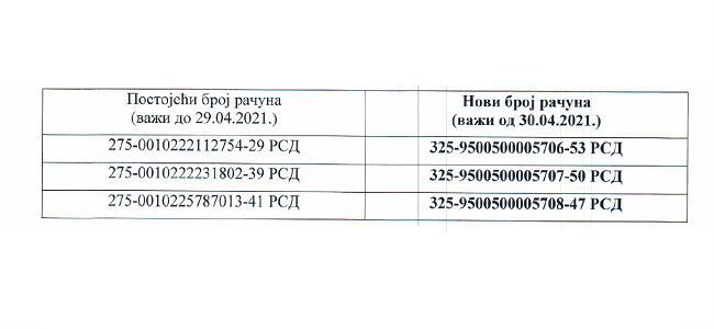 Počev od 30.04.2021. godine doćiće do promene tekućeg računa JKP “Vodovod Valjevo u skladu sa donjom tabelom:
